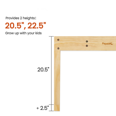 Provides 2 heights: 20.5'', 22.5’'. You can easily add the 4 extender blocks to the legs to adjust the height. Let your child play at a comfortable height. Grow Up With Your Kids! Perfect for kids aged 3+.