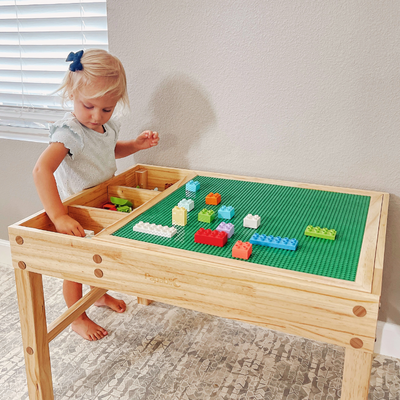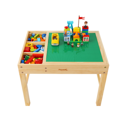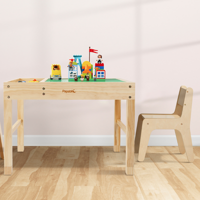 The tabletop is made of a double-sided surface playboard. One side of reversible board is a building brick surface, provides a perfect space for kids to enjoy construction playtime. The Other side is a smooth surface, ideal for drawing, studying or playing other games.
